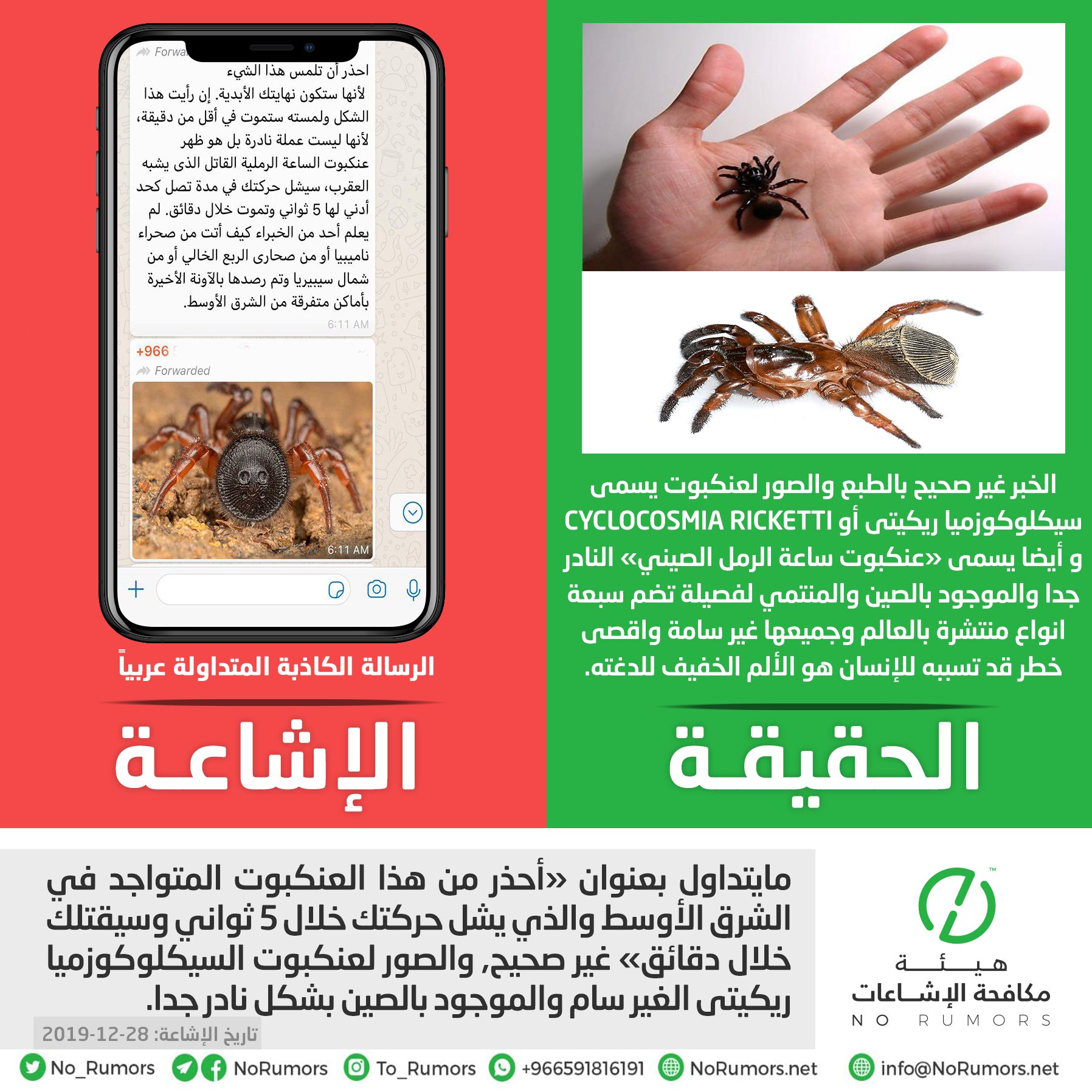 هيئة مكافحة الإشاعات على تويتر مايتداول بعنوان أحذر من هذا العنكبوت المتواجد في الشرق الأوسط والذي يشل حركتك خلال 5 ثواني وسيقتلك خلال دقائق غير صحيح والصور لعنكبوت السيكلوكوزميا ريكيتى الغير سام